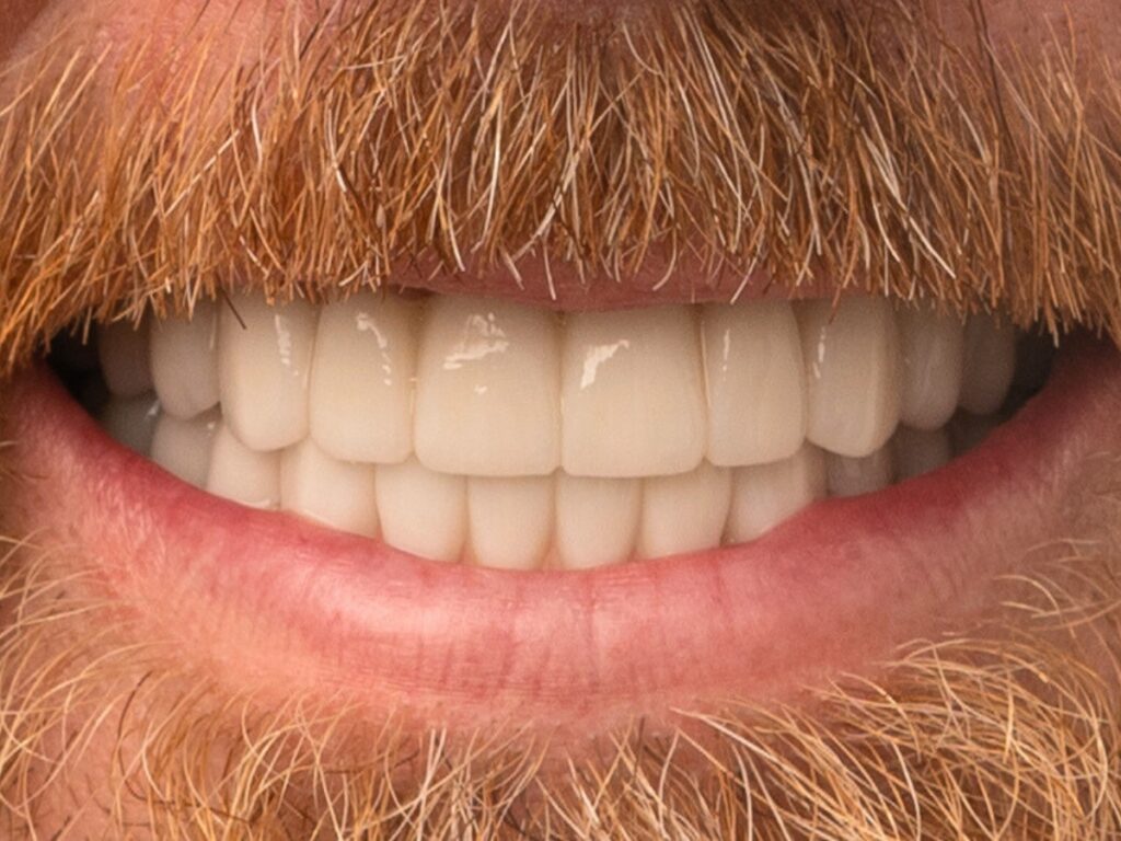 An FP1 full arch dental implant restoration (often associated with “3 on 6” restorations or implant bridges) is a fixed, non- removable solution for replacing a full set of missing or failing teeth. It is designed to closely resemble natural teeth emerging from healthy gums, without the use of artificial pink material.
